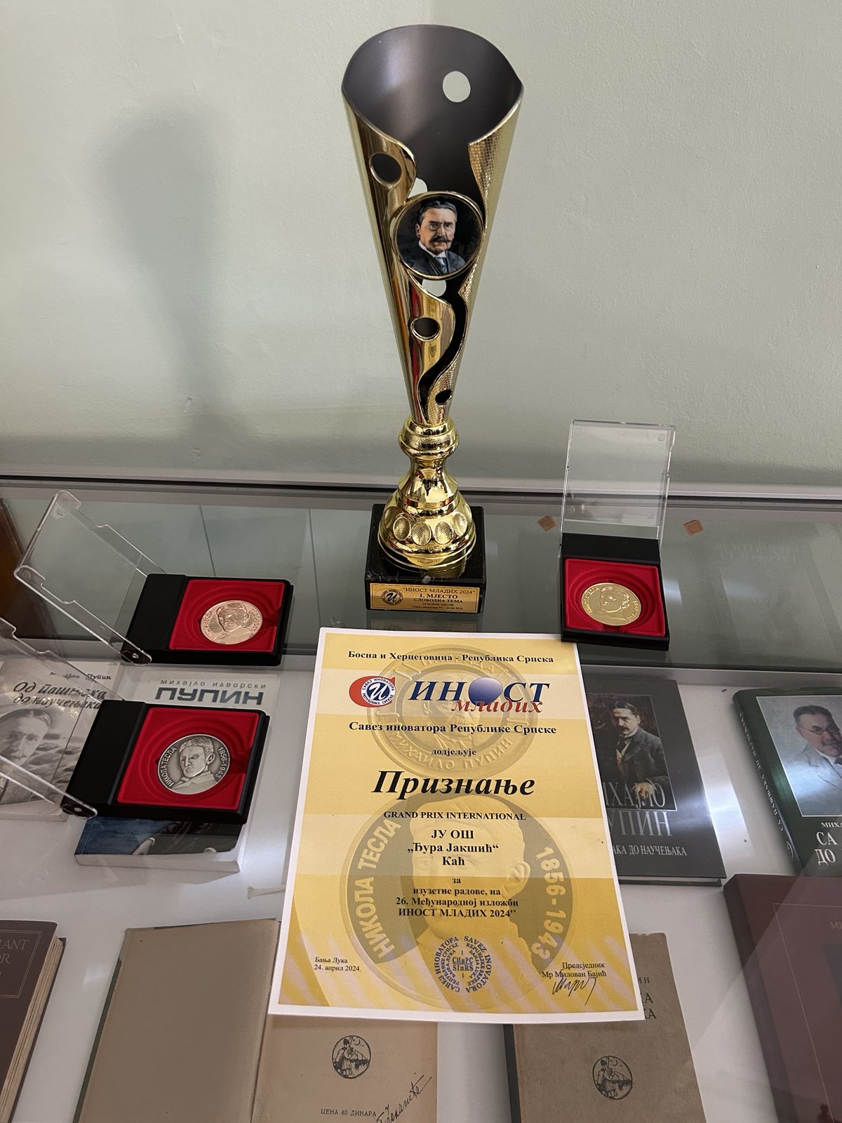 Гранд При награду нашој школи на манифестацији поводом 170 година од рођења Михајла Пупина у Идвору, плакете и дипломе нашим најуспешнијим ученицима – такмичарима ( 1.место и златна плакета Андреју Перичићу, Лени Тутуш и Милошу Мишићу, 2.место и сребрна плакета Александру Стричевићу и Петру Чвокићу, 3.место са бронзаном плакетом уручени су  Наташи Стојковић и Теодору Кишу, као и златна плакета  са дипломом уручена ментору – наставници Јасмини Јерковић) уручене су за врхунска постигнућа у оквиру тамичења ИНОСТ МЛАДИХ у организацији Савеза Иноватора Републике Српске из Бања Луке.